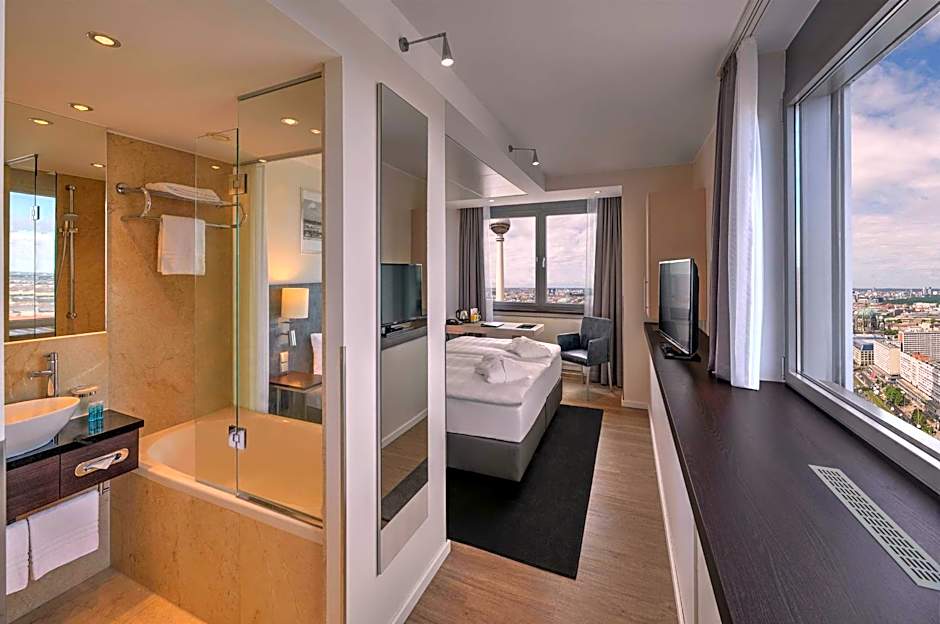 Features large windows with great views of Berlin's city center and TV tower.